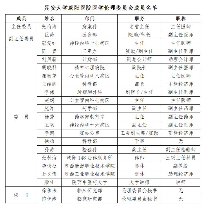 为了规范组织药物/器械临床试验伦理审查工作,确保临床试验过程符合伦理要求,我院遵照《药物临床试验伦理审查指导原则》、《医疗器械临床试验质量管理规范》、《涉及人的生命科学和医学研究伦理审查办法》及《赫尔辛基宣言》的要求,结合我院实际情况,建立“延安大学咸阳医院医学伦理委员会”对我院药物/器械临床试验进行伦理审查工作,从而保证受试者权益。“延安大学咸阳医院医学伦理委员会”由医药专业、非医药专业、法律专家、伦理学以及独立于研究/试验单位之外的人员共20名委员和2名秘书组成。