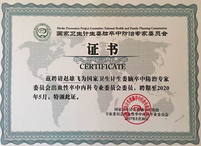 赵雄飞 延安大学咸阳医院副院长兼脑血管病医院院长。主任医师、延安大学教授、硕士研究生导师,美国•斯坦福大学医学院访问学者。主攻脑血管病,尤其对于脑血管病的规范化诊治、康复及预防和脑血管病的介入诊疗,已得到国内大多数专家的认可及接受。发表论文数十篇,其中SCI杂志7篇,中华全科医师杂志3篇,荣获陕西省省级科技成果一项,咸阳市市级科技进步奖一等奖1项,二等奖2项,三等奖1项;独立主编《新编脑血管病治疗学》。以副主编的身份参编《心脑疾病治疗决策》。现任国家卫健委脑卒中防治专家委员会出血性卒中内科专业委员会委员,中国研究型医院学会介入神经病学专业委员会委员。南京国际脑血管病高峰论坛国内专家委员会委员,全国神经血管介入协作组成员,陕西省卒中学会第一届神经介入分会委员,四川省第二届临床技能名师,四川省生物信息学会神经病学分会常务委员,四川省中医药学会中医脑病专委会常委,四川省中医神志病质控中心成员,四川省成都市高新区医学会神经内科分会常委,四川省眉山市医学会介入医学专委会主任委员,四川省眉山市医学会脑卒中专委会主任委员,咸阳市医学会物理与康复专委会主任委员,咸阳市康复医学质量控制中心主任。